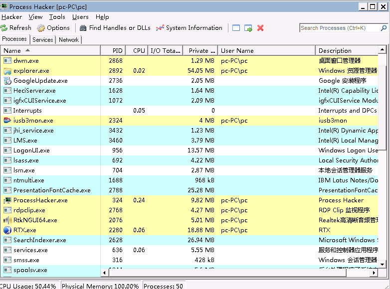 ProcessHacker可查看所有进程信息,包括进程加载的dll、进程打开的文件、进程读写的注册表等等,也可以将特定进程的内存空间Dump到本地,此外还可以查看网络连接。工具截图如下: