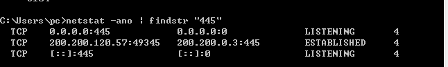 同时也可以使用netstat命名查看当前关于445端口与139端口的进程或者其他端口