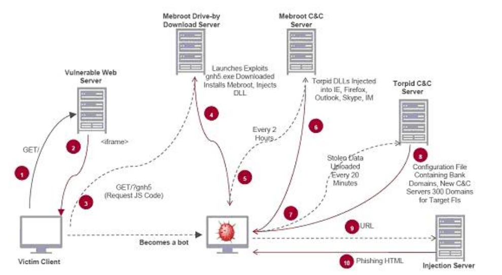 以僵尸网络程序Torpig为例,该僵尸网络程序的目的就是窃取身份认证信息、信用卡、银行账号和支付宝账户等。典型的Torpig感染方式如下图所示: