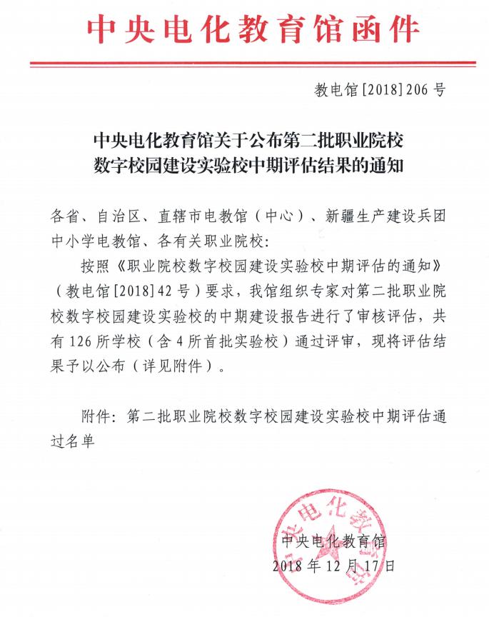 根据中央电化教育馆关于职业院校数字校园建设实验校中期评估结果(教电馆〔2018〕206号)。我院已顺利通过本次审核评估,被中央电化教育馆授予“数字校园建设实验校”称号。