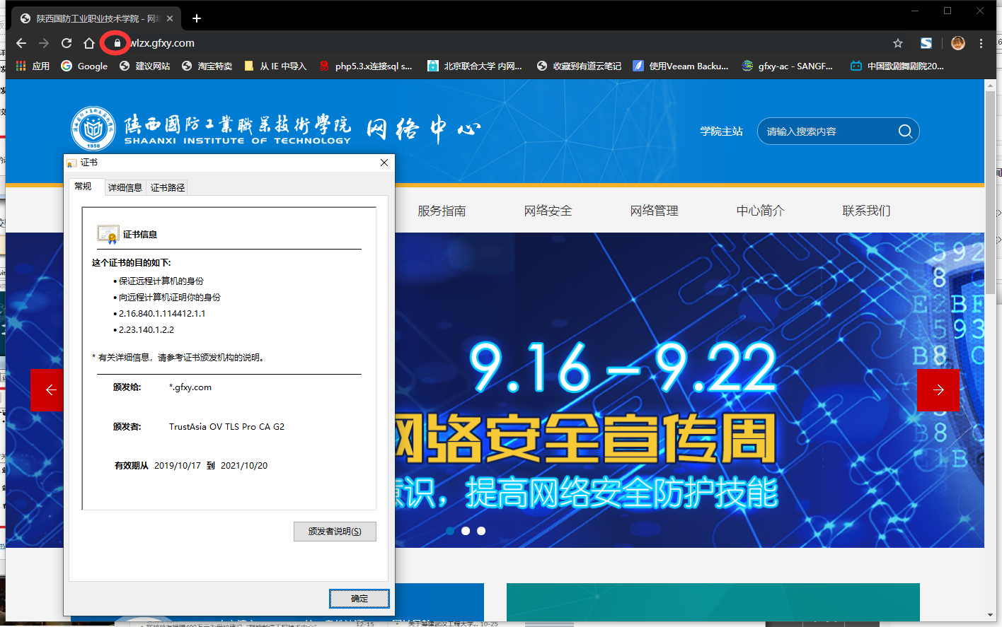 随着我校信息化建设的不断发展,各类应用系统及应用也越来越多。在网络安全形势日益严峻的今天,为了切实保障各应用系统的安全,让广大师生放心地使用各类系统,对网络传输数据进行加密,防止数据被截取或窃听的需求就显得尤为重要,需求也越来越迫切。为此,我们采购了通用型SSL协议证书,可对学校全域名(*.gfxy.com)进行有效防护,并在用户的浏览器与WEB服务器之间建立了一条快速的安全通道,防止数据被截取或窃听。