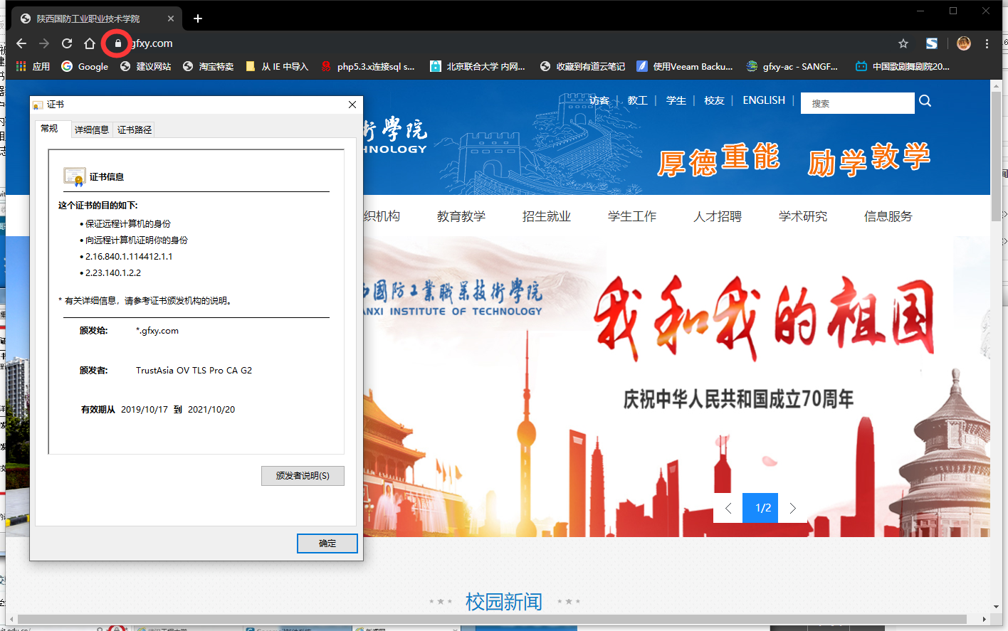 2019年10月,我校完成学校门户网站、网站群管理系统的SSL(Secure Socket layer)证书部署。这一部署,将大大地增强我校相关网站的访问安全性。