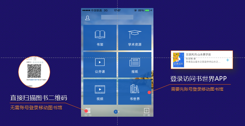 (2)支持IOS及Android手机等移动终端安装“超星移动图书馆”APP来阅读和下载超星书世界图书。在手机上安装完“超星移动图书馆”,通过移动图书馆的书世界栏目访问电子图书。或者通过移动图书馆的扫描网站上喜欢图书的二维码进行下载电子书。