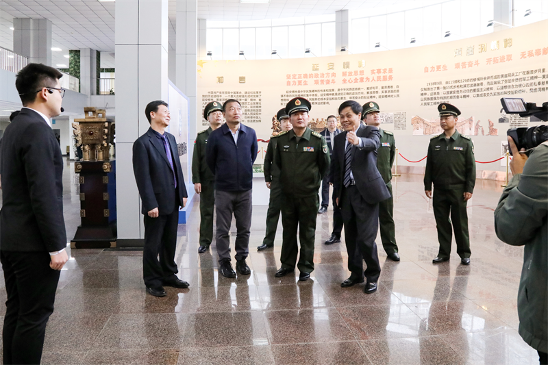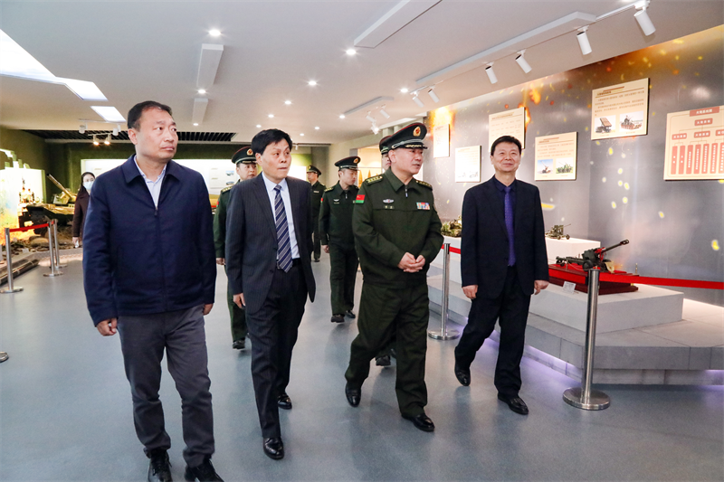 仪式结束后,参加揭牌仪式的领导在学校党委书记张卫平和校长刘敏涵的陪同下参观了学校校园军工文化墙、砺剑广场、预征班宿舍、户外军事素质拓展中心、国防科技展览馆、学校征兵工作站。