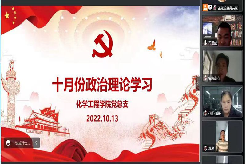 【化工学院党总支】2022年10月13日下午,化学工程学院党总支组织召开了10月份教职工政治理论学习会,活动采用线上腾讯会议的形式,会议由党总支书记孟龙主持。