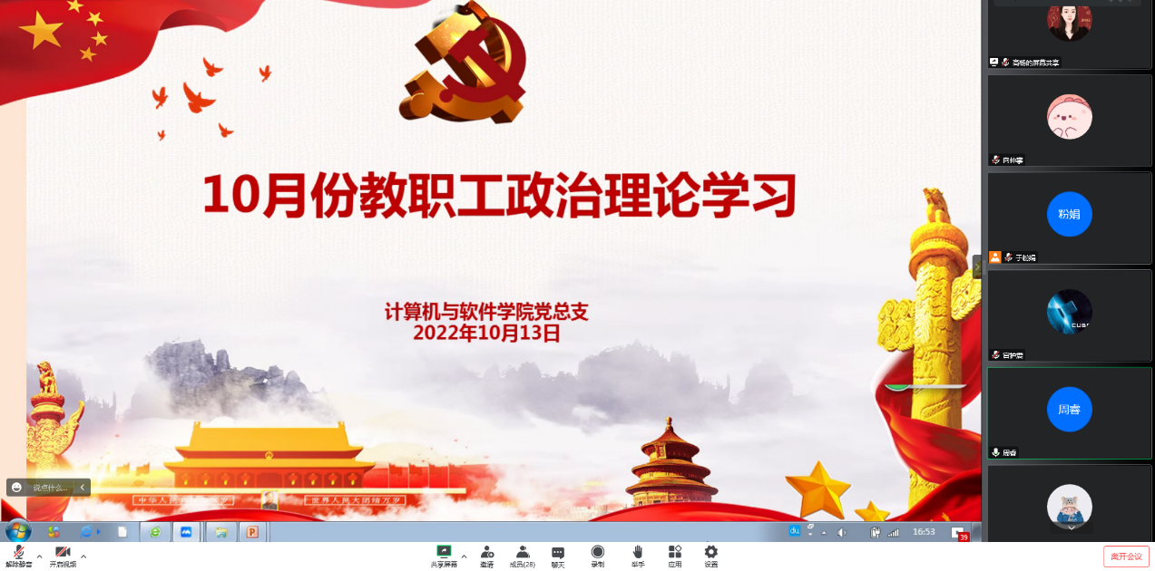 【计算机学院党总支】10月13日下午,计算机与软件学院组织全体教职工通过腾讯会议在线上进行了十月份政治理论学习,学习由分院党总支副书记魏晓艳主持。