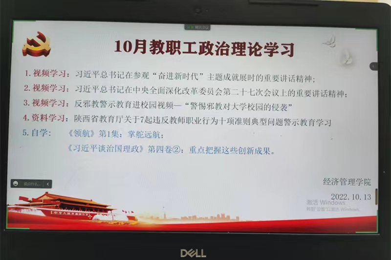 【经济管理学院党总支】10月13日下午,经济管理学院党总支利用腾讯会议开展10月份政治理论学习,全体教职工参加了本次学习,会议由党总支组织委员李志春主持。