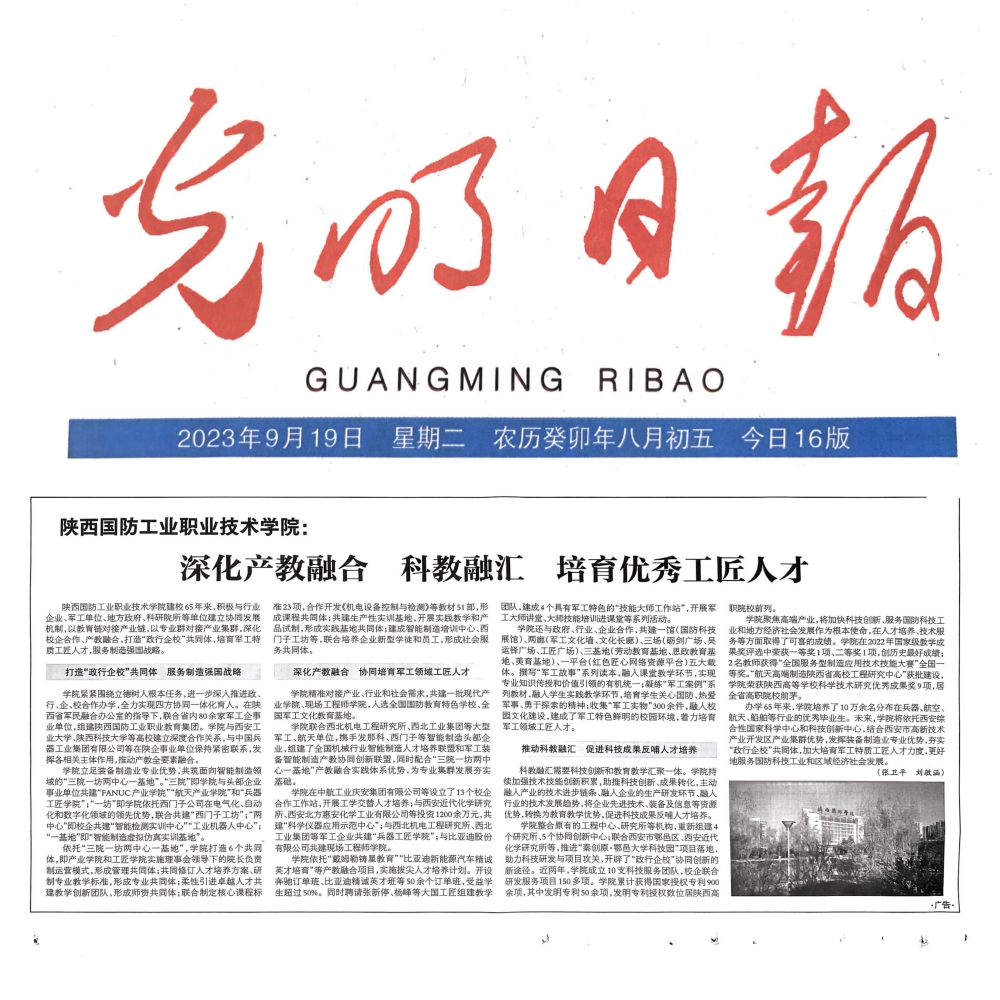 学院紧紧围绕立德树人根本任务,进一步深入推进政、行、企、校合作办学,全力实现四方协同一体化育人。在陕西省军民融合办公室的指导下,联合省内80余家军工企事业单位,组建陕西国防工业职业教育集团。学院与西安工业大学、陕西科技大学等高校建立深度合作关系,与中国兵器工业集团有限公司等在陕企事业单位保持紧密联系,发挥各相关主体作用,推动产教全要素融合。