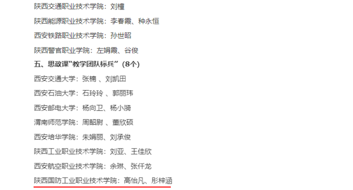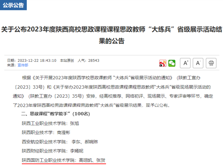 12月22日,陕西省委教育工委、陕西省教育厅公布了2023年度陕西高校思政课程课程思政教师“大练兵”省级展示获奖结果。我校马克思主义学院教师高怡凡、经济管理学院学生肜梓涵获思政课“教学团队标兵”称号,张贺、高翊凯获思政课“教学能手”称号。