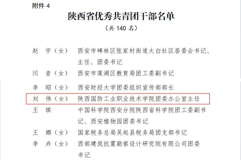 1月31日,共青团陕西省委下发了《共青团陕西省委关于表彰2022-2023年度陕西省五四红旗团委、陕西省五四红旗团支部、陕西省优秀共青团员、陕西省优秀共青团干部的决定》。我校团委办公室主任刘伟荣获“陕西省优秀共青团干部”,计算机与软件学院2021级软件技术专业学生晏铁男荣获“陕西省优秀共青团员”。