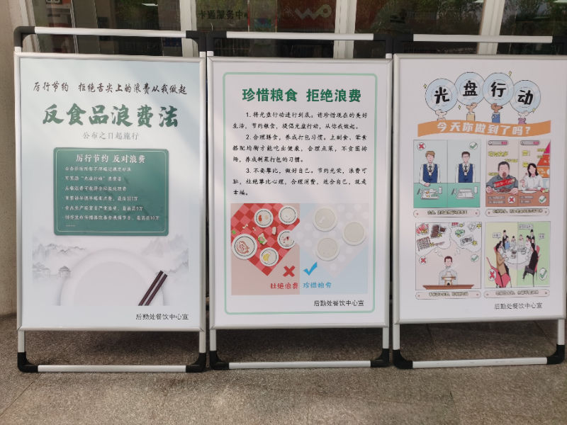 餐饮中心制作了宣传横幅和制止浪费标语、展板海报,向全校师生广泛宣传崇尚文明消费,制止餐饮浪费的良好饮食习惯。组织组织7名餐厅经理签订反餐饮浪费承诺书,开展餐饮从业人员反餐饮浪费签名活动和学生反餐饮浪费签名活动,通过反餐饮浪费签名活动,引导广大学生树立正确食品消费观,增强节约意识,争做理性消费“践行者”。