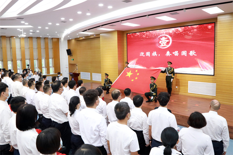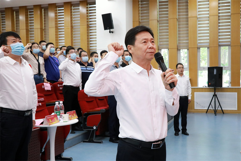 全体教师面向国旗庄严宣誓,党委书记张卫平领誓。