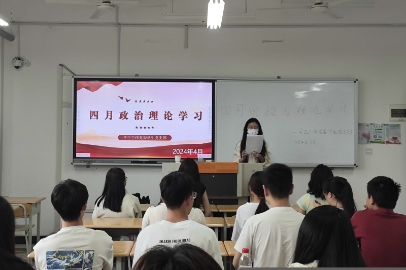 【必威app安卓版无弹窗党委学生党支部】我校必威app安卓版无弹窗党委学生党支部于4月24日17:30在北校区4-133教室开展四月份政治理论学习,其中,学生党支部2023秋季积极分子、预备党员、正式党员,2023年春季积极分子、预备党员共计113人,通过线上和线下相结合的方式参与了本次理论学习。会议由学生党支部宣传委员贾琬朝主持。