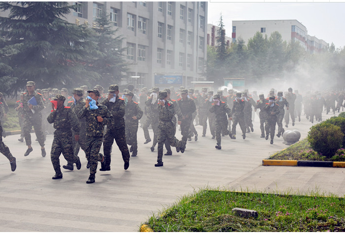 下午3:15,随着消防官兵同志的一声令下,瞬间教学楼内浓烟滚滚,学生们分别从教学楼的各个消防通道撤离到砺剑广场,并有序按连队排成方阵。紧接着消防队员们身着消防服、持灭火水带、手提灭火器,迅速到位,将“火”扑灭。