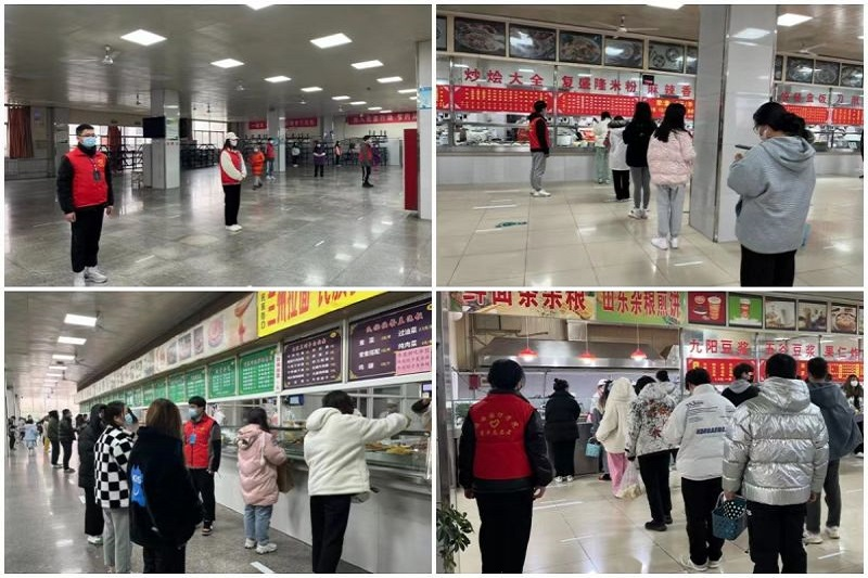集结会结束之后,A组志愿服务队在王鹏和孙萌的带领下,奔赴防疫一线,开启了首次志愿服务工作。志愿者们兵分五路,分别在我校餐厅门口、一楼西区、一楼东区、二楼西区、二楼东区执勤,协助餐饮中心工作人员维护现场秩序,引导购餐学生带好口罩、保持间距、有序排队。目前,我校在防疫封控期间,施行餐厅不堂食、一人代买饭的制度,志愿者帮助购饭学生端拿餐盒,为双手捧餐的学生拉开门帘,在收获了一声声学生的感谢之后,志愿者们的脸上扬起了幸福的微笑。