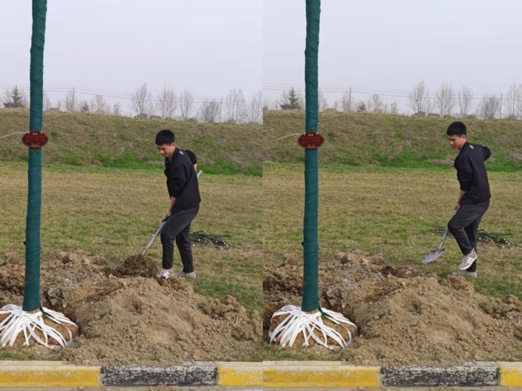 活动现场,大家在园艺指导师傅的指导下,密切分工,团结协作,手持铁锹和水桶,扶直树干、挥锹铲土、培实新土。经过一番努力,一棵棵新栽种的树苗迎风挺立,为校园增添了新绿。
