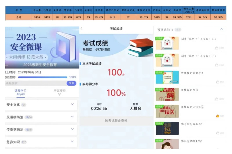 “生命重于泰山,安全高于一切”。安全教育是校园生活中不可或缺的一部分,特别是对于刚刚走入大学校园的新生尤为重要。为帮助新生树牢安全理念、增强安全意识,增强防范能力,以更好的状态迎接新学期、开启新征程,党委必威app安卓版无弹窗部易班发展中心从8月26日至9月30日,在2023级学生中开展为期一个月的易班新生安全教育学习活动。本次学习我校共5456名学生线上参与,其中登录率、学习率、课程完成率、考试率均达到99%以上。