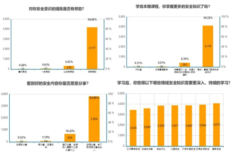 课后问卷调查结果显示,有92.02%的学生认为通过本期学习对自己的安全意识提升很有帮助,有90.72%的学生认为通过本期学习学会了很多的安全知识,同时有98.92%的学生希望之后还有机会系统学习更多安全知识,有83.85%的学生愿意分享安全知识给他人。在活动过程中还发现有4073名同学希望更深入持续地学习国家安全,3944名希望深入持续学习日常生活安全,3880名学生希望深入持续学习大学生校园安全,3871名学生希望深入持续学习增加线下心理安全等。