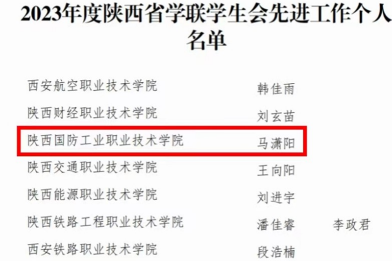 近日,陕西省学生联合会下发《关于2023年度陕西学联学生会组织工作评议结果的通报》,我校学生马潇阳被评为“2023年度陕西省学联学生会先进工作个人”。