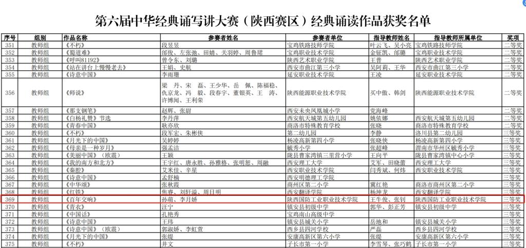 2024年9月11,第六届中华经典诵写讲大赛(陕西赛区)评选结果揭晓,我校报送的2项参赛作品均获得佳绩。其中,孙萌、范爽老师指导的作品《盛开的民族团结之花》荣获职业学校学生组三等奖,王牛俊、张钊老师指导的作品《百年交响》荣获教师组三等奖。