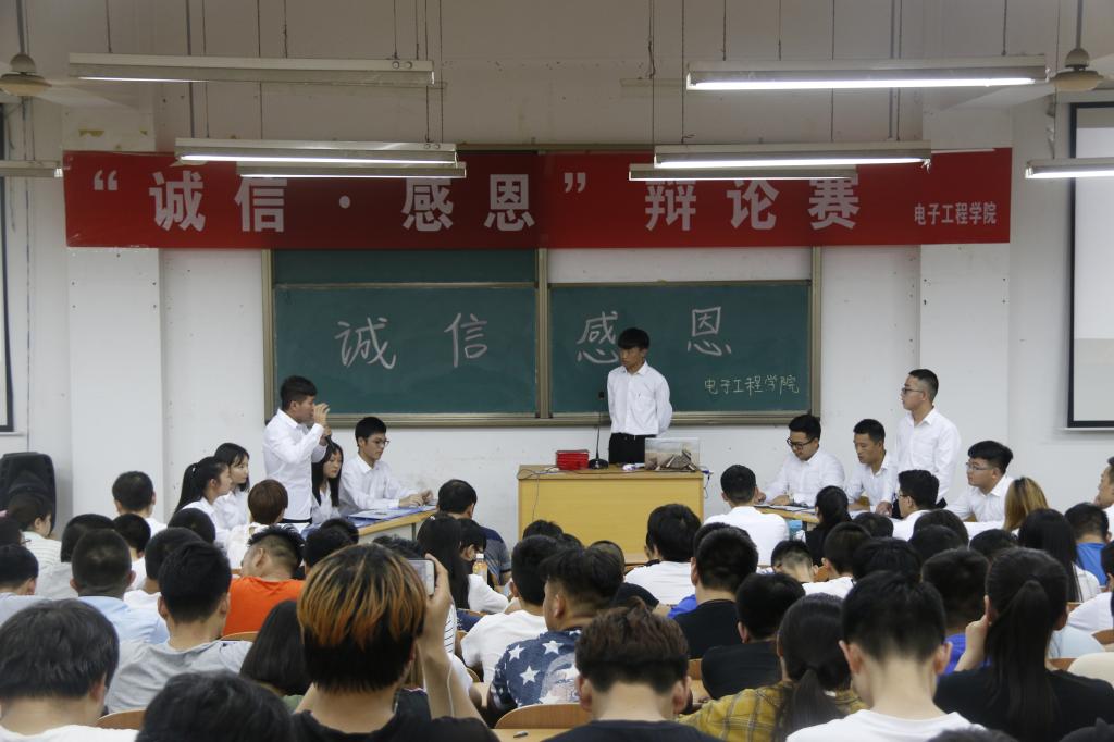 5月17日晚上19:30,电子工程学院以“诚信•感恩”为主题辩论赛”总决赛在教3-233教室举行,共有四对进行决赛比拼,同学们围绕着感恩是一种品德还是责任,是源于社会还是个人进行了激烈的辩论,整个过程中正方和反方都能列举出充分的论证和论据进行辩驳,维护自己的观点,经过激烈的角逐:信息3163班荣获得一等奖、电子3162班荣获二等奖、电子3171班荣获三等奖、无人机3171班荣获优秀奖。