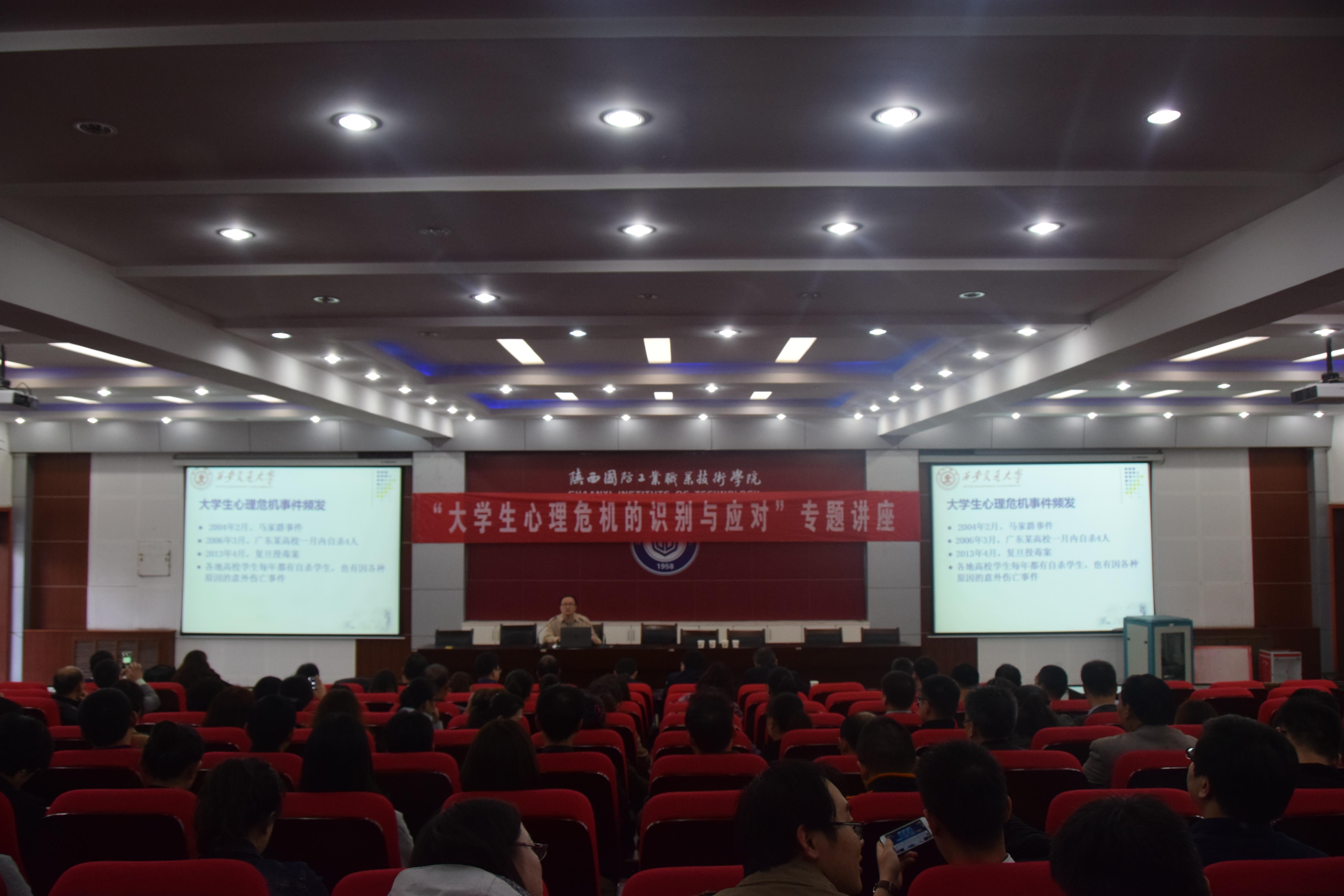 10月18日下午4点30分,学生处于北校区教学二楼报告厅组织召开全院辅导员心理健康讲座,西安交通大学大学生心理健康教育与咨询中心主任姚斌博士应邀作了以“大学生心理危机的识别与应对”为主题的心理健康教育专题讲座。我院学生处老师、分院党总支书记、学生科科长、学生管理干事及全体专兼职辅导,共计150余人参加了本次讲座。