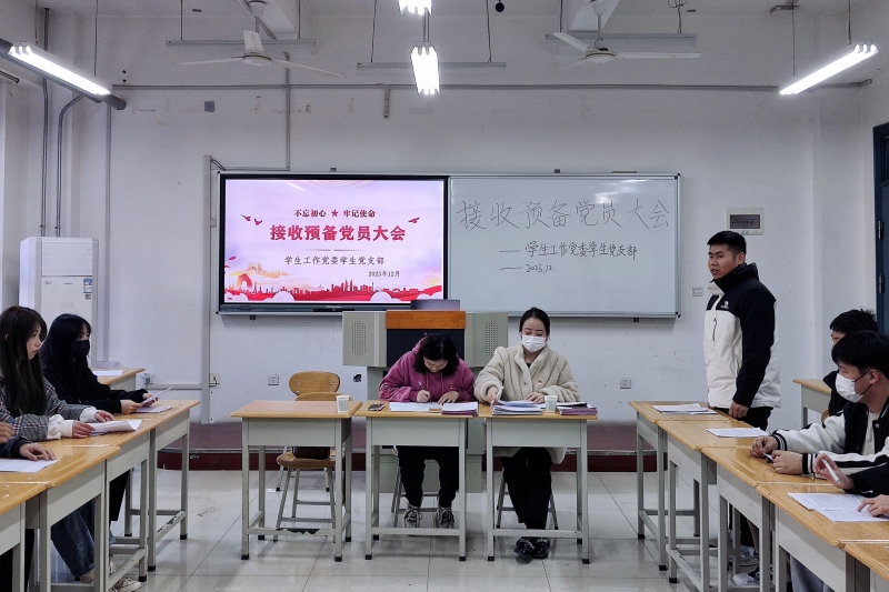 其次,开展了2023年秋季接收预备党员大会。由刘伟报告党员出席情况,随后由各位发展对象做自我介绍并宣读入党志愿书,学生党支部发展对象选逐一向党组织汇报自身对党的认识、入党动机等,表明自己已经做好接受党组织考验的准备。随后,刘伟和贾琬朝分别向支部大会介绍发展对象在考察培养期间政治思想、工作学习、作风纪律等方面的综合表现,并对其能否入党表明意见。刘伟代表支委会向大会报告了每位发展对象的审查情况和支委会意见,并对是否符合党员条件进行充分讨论,经支部大会正式党员举手表决,同意接收刘洋洋等17名同志为中共预备党员。
