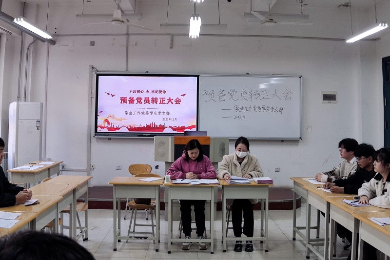 首先会议开始,由16名预备党员依次在大会上汇报过去预备期以来个人在思想、学习和工作情况,表达了入党的意愿和决心,既总结了学习成绩与进步,也指出了自身存在的问题。接着由介绍人对各位预备党员预备期间的工作情况、考察情况和个人政审情况进行了介绍,接着与会党员发表意见并提出不足和期望。随后参会的正式党员对于预备党员转为正式党员进行讨论和表决,一致同意吕恒博等16位预备党员全部按期转正。最后所有转正的正式党员表态发言,表达对以后个人组织发展、理论学习、生活作风等的看法和决心。