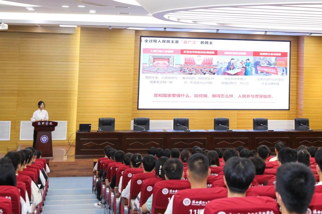 在本次宣讲活动中,胡可主要围绕“坚持制度自信 发展全过程人民民主”和“高质量发展‘高’在哪儿”两个主题,面向宣讲对象进行了理论阐释和案例解析,在“坚持制度自信 发展全过程人民民主”主题中,宣讲以“豆选”案例引入,从全过程人民民主是全体人民的民主、是人民全过程参与的民主、是“最广泛”“最真实”“最管用”的民主等方面进行了重点讲解,生动讲述了我国全过程人民民主的具体实践,展现了中国特色社会主义民主制度的优越性;在“高质量发展‘高’在哪儿”主题中,宣讲从“一粒米中的硬科技”切入,生动展示了我国农业发展的现状;以“高铁与绿皮火车你选择哪一个”为话题,与现场同学进行互动,引出欠发达地区如何因地制宜走出适合本地区实际的发展之路,进而阐释高质量发展强调的是质量,而非速度,强调的是发展而非增长,回答高质量发展“高”在哪儿。