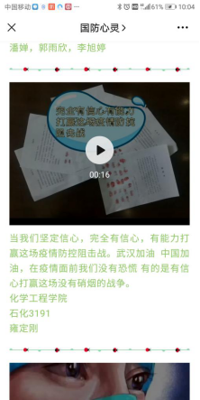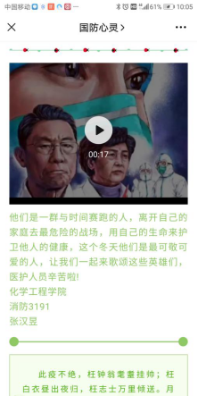 为进一步落实立德树人的根本任务,探索疫情防控条件下的心与人新途径,我校积极开展宣传季线上活动,引导帮助广大学生加强心理防护,以阳光健康的心态面对疫情。按照我校大学生心理健康教育中心的相关工作要求,我校校学生会心理部及大学生心理协会在3月份积极结合我校实际情况组织开展了主题为“心理战役”短视频征集大赛。鼓励学生用影像记录疫情期间的点滴和感动,记录生活,感悟成长,传递力量,坚定抗击疫情的必胜信念。