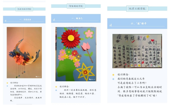 之后由校学生会心理部学生组织线上评选活动,共有3178名学生参与此次评选,最终艺术与设计学院的月亮花舟以669票获得一等奖,智能制造学院的“做自己”、机械工程学院的剪纸奥义获得二等奖,计算机与软件学院的科技之光照亮新时代中国、经济管理学院的剪纸小样、化学工程学院“疫”难平获得三等奖。