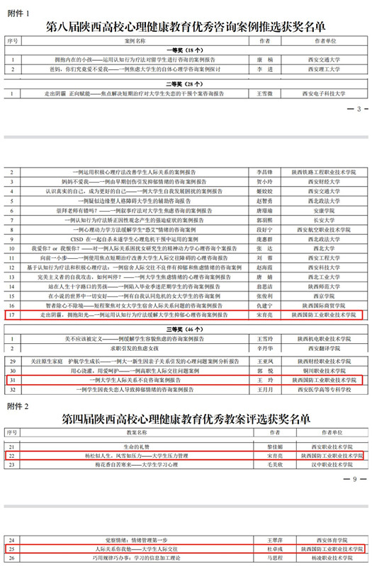 经过精心准备、认真打磨,最终我校心理中心专职教师宋育亮《走出阴霾,拥抱阳光—一例运用认知行为疗法缓解大学生抑郁心理咨询案例报告》、心理中心专职教师王玲《一例大学生人际关系不良咨询案例报告》分别获得第八届陕西高校心理健康教育优秀咨询案例二、三等奖,心理中心专职教师宋育亮《杨松似人生,风雪如压力——大学生压力管理》、心理中心兼职教师杜卓彧《人际关系你我他——大学生人际交往》获得第四届陕西高校心理健康教育优秀教案三等奖。