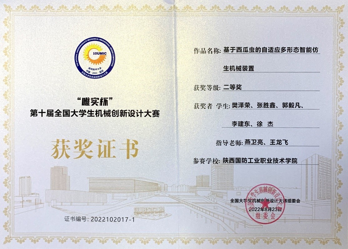 9月15日,我校收到“唯实杯”第十届全国大学生机械创新设计大赛的获奖证书,该大赛于8月23日在深圳技术大学成功举行。经过激烈角逐,我校机械工程学院燕卫亮、王龙飞老师指导,樊泽荣、张胜鑫、郭毅凡、李建东、徐杰等5位学生研制的参赛作品《基于西瓜虫的自适应多形态智能仿生机械装置》获得全国二等奖,这是我校参加该赛事以来取得的最好成绩。