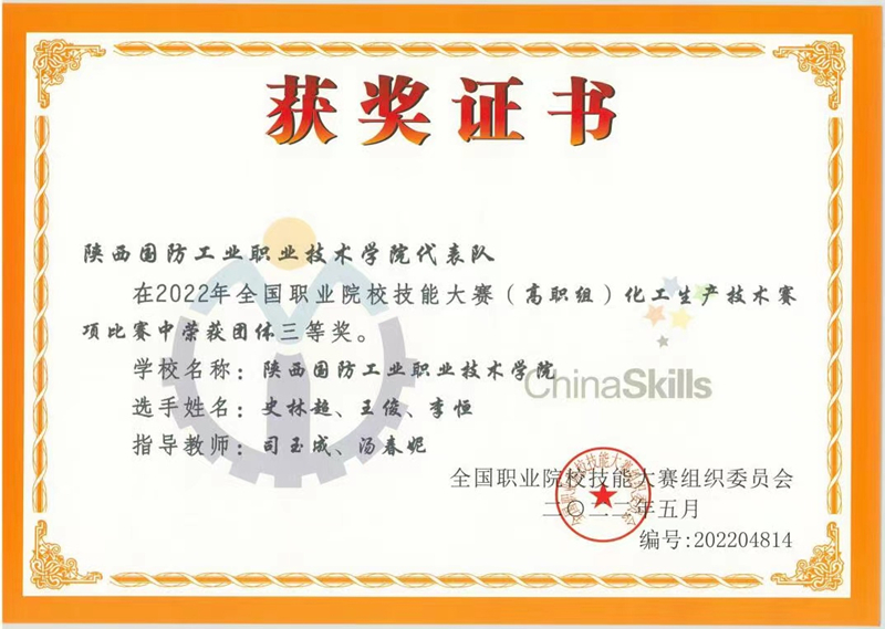 9月19日至22日,2022年全国职业院校技能大赛(高职组)“化工生产技术”赛项在宁夏工商职业技术学院举行,来自全国28个省(自治区、直辖市)46支代表队的138名参赛选手同台竞技。经过3天的激烈比拼,由我校化学工程学院司玉成、汤春妮老师指导的史林超、王俊、李恒等3名学生组成的陕西省代表队最终获得国赛三等奖。