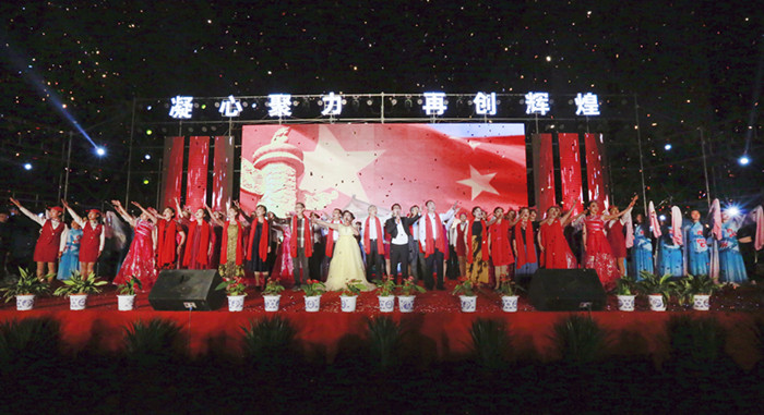 晚会在《我爱你祖国》浑厚的歌声中圆满落幕,学校领导上台与全体演职人员亲切握手交流并合影留念。
