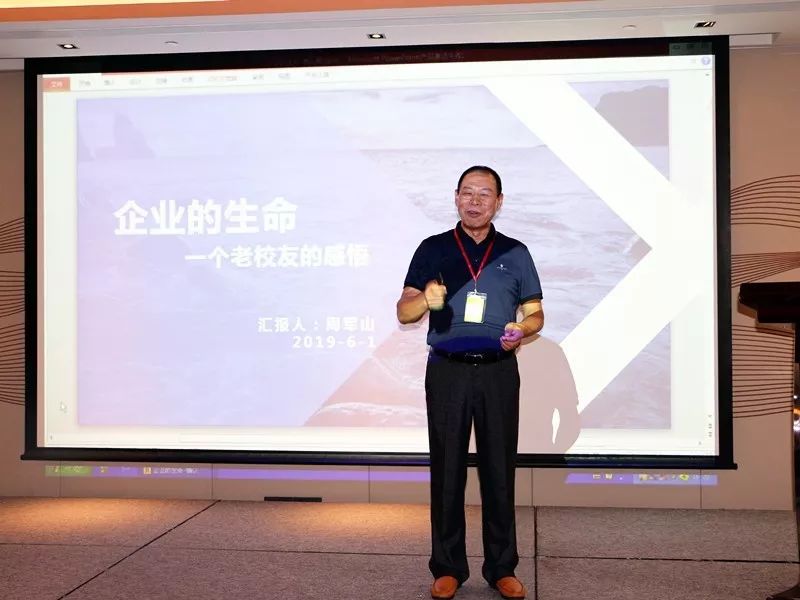 广东索奥斯玻璃技术有限公司董事长、校友周军山以《企业的生命》”为主题作了演讲,研判当前“实体经济的现状”,结合“企业生命周期”理论,阐明了“坚持——生存才是硬道理”、 “发展——企业战略价值观”、“长远——企业文化的传承”等真知灼见,最终凝练出“精益求精,做百年品牌;务实负责,做发展伙伴”的办企业道理,给与会校友留下了深刻印象,引发现场热烈掌声。