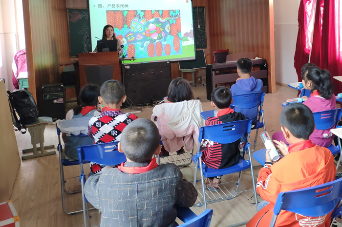 艺术学院副院长管阳将户县农民画带入课堂,通过讲解、演示开发孩子们的创作能力,再利用绘画、裁剪、拼贴的方法,让学生们参与其中,共同完成了一副精美的农民画。