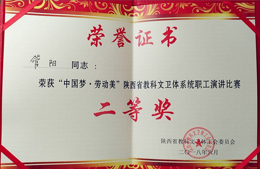6月5日至7日,由陕西省教科文卫体工会主办的2018“中国梦·劳动美”职工演讲比赛在西北大学举行,来自陕西省教科文卫体系统46家参赛单位的85名选手同台竞技,我院管阳老师代表学校参加比赛,并以总决赛第四名的优异成绩获得本次大赛的二等奖。