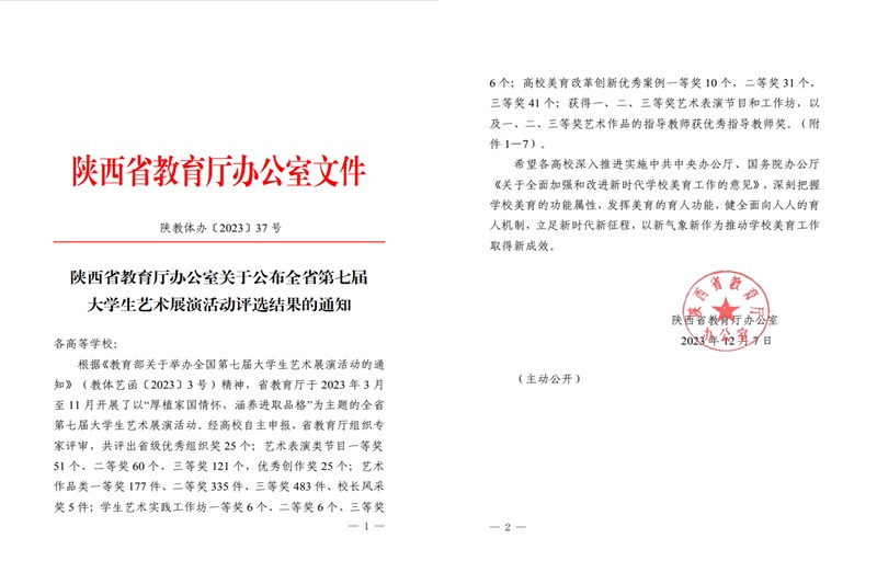 近日,陕西省教育厅发文,公布了以“厚植家国情怀,涵养进取品格”为主题的全省第七届大学生艺术展演活动获奖名单,我校报送的作品在本次展演活动中斩获佳绩、实现突破。