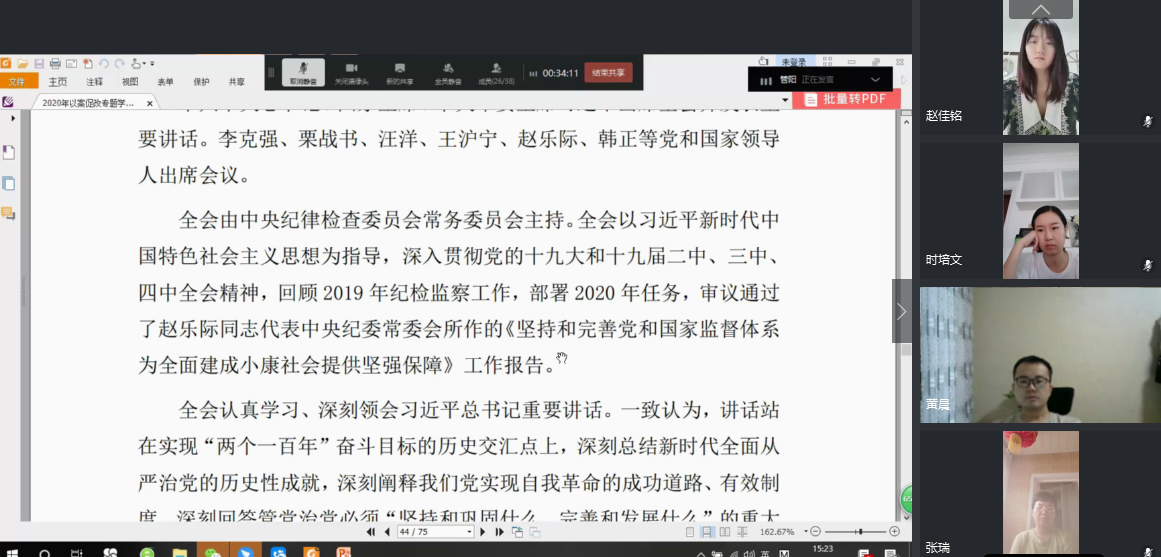 党总支组织委员王志刚带领大家学习了《胡和平在十三届省纪委四次全会上的讲话》和《中国共产党陕西省第十三届纪律检查委员会第四次全体会议决议》。他指出,我们要紧密团结在以习近平同志为核心的党中央周围,要不断攻坚克难、奋力进取,为学院的发展添砖加瓦。
