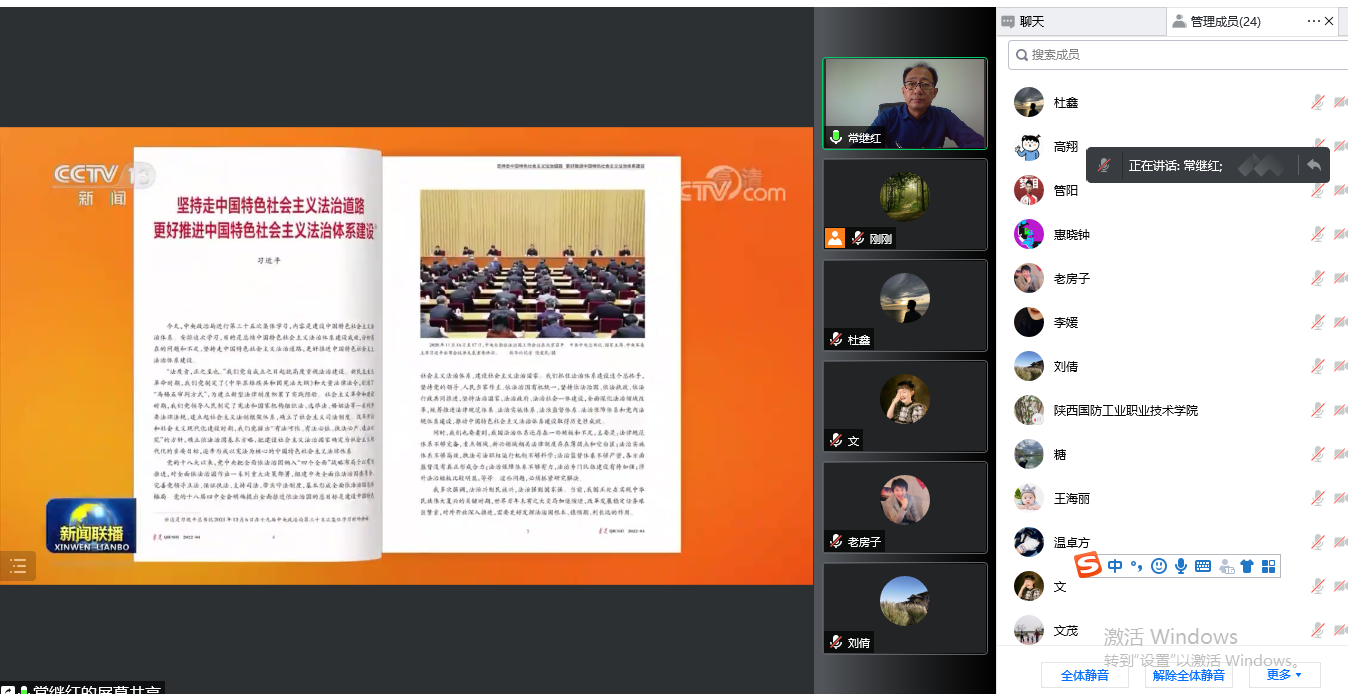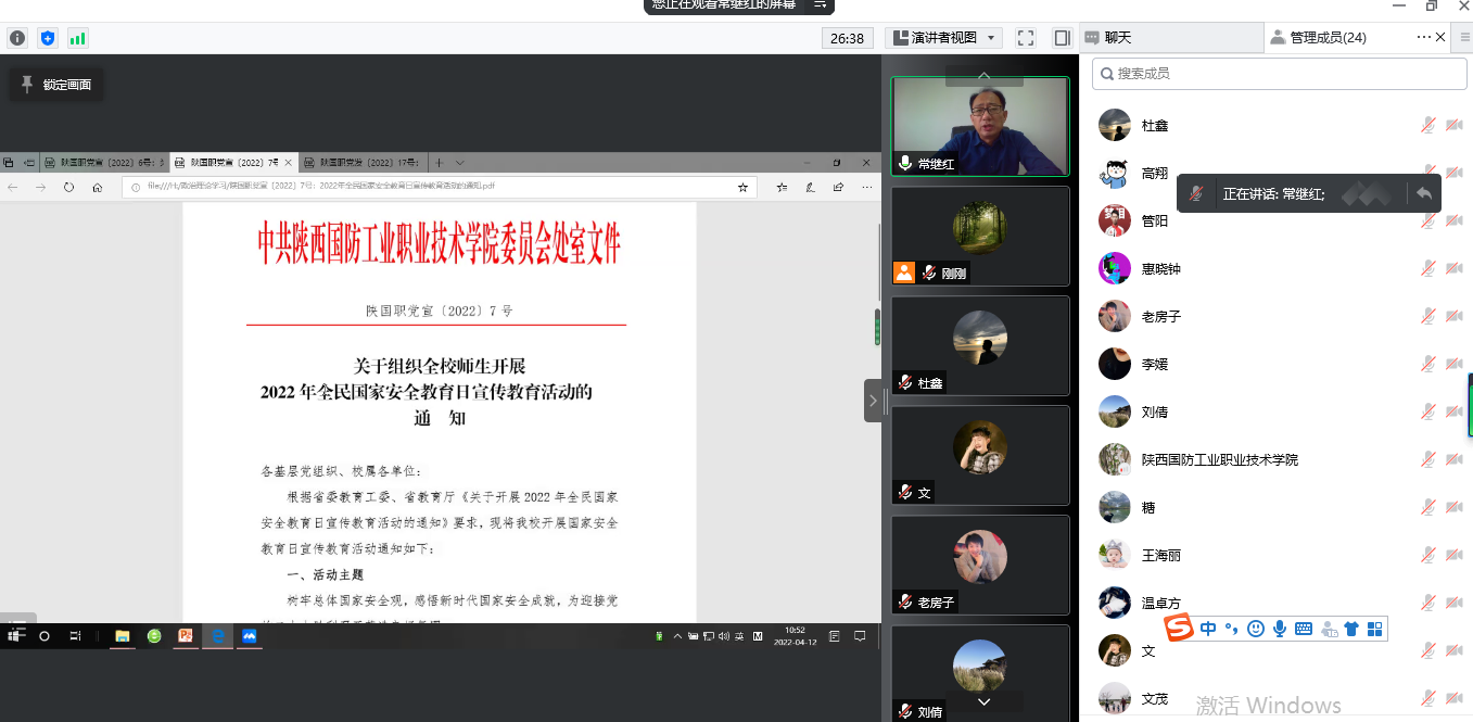 接着,常继红结合学校《2022年全民国家安全教育宣传日教育的活动》(陕国职党宣〔2022〕7号)和《关于举办校园网络文化节的通知》(陕国职党发〔2022〕17号)等文件精神,开展了动员学习活动。最后他强调,要将学习宣传贯彻习近平总书记重要讲话精神和全国两会精神作为一项重要任务,党史学习教育是以习近平同志为核心的党中央立足百年党史新起点、着眼开创事业发展新局面作出的一项重大战略决策,要结合工作实际认真做到学史明理、学史增信、学史崇德、学史力行,使党史学习教育常态化长效化,切实提高自身政治素质和理论水平,为学校创建文明校园和双高建设做出自己应有的贡献,以实际行动和优异的成绩迎接党的二十大的胜利召开!