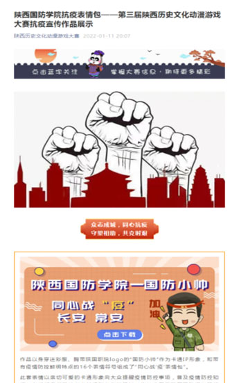 《UI界面设计》授课教师文茂以抗击疫情为切入点,带领学生设计制作了《国防小帅——同心战“疫”》微信表情包,以亲切可爱的卡通形象向大众进行疫情防控提醒,普及疫情防控知识,在缓解疫情带给大家的紧张气氛的同时,向社会展示陕国职院师生团结一心、抗疫必胜的决心和信心!此套表情包被第三届陕西历史文化动漫游戏大赛选用并展示。