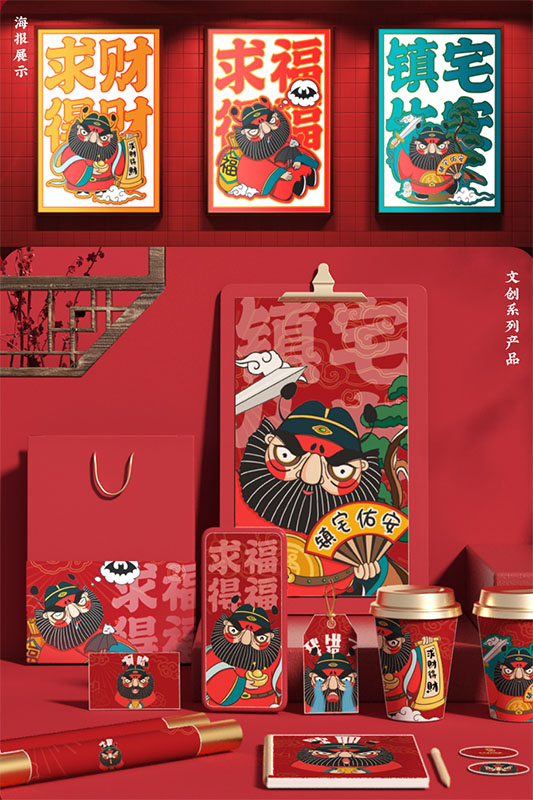 经过多次打磨与改稿,参赛作品主题最终定为“钟馗民俗文化”。该形象以钟馗为原型,在保留了原有的造型特征下进行卡通化、趣味化的创作。服饰及配色使用极富传统特色的中国红、孔雀蓝、松石绿凸显人物特征、形象在不同场景下的趣味画面,构成了钟馗民俗文化系列产品的视觉主题。钟馗自古以来受到百姓喜爱,作为万应之神,钟馗形象寓意吉祥,通过文创产品使钟馗民俗文化融入百姓生活,更容易引发消费者情感上的共鸣,使每一位消费者在使用产品时,能用一种更有趣的方式解读中国传统文化内涵,传递积极向上的生活态度。