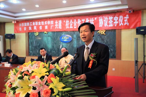 张文斌书记代表学院向校企合作工作站的挂牌表示衷心的祝贺,向长期以来给予学院大力支持的西安东风仪表厂表示诚挚的谢意!张书记简要对学院发展的历程、办学理念、办学规模、办学条件、师资队伍和办学成就作了介绍。他在讲话中强调指出,校企合作是学校发展的需要,也是企业发展的需要,学院将借此次校企合作工作站挂牌的机会,充分发挥自身资源优势,不遗余力地推动校企深度融合、产学紧密结合,形成行业政策推动、学校服务驱动、社会支持监督、成果多方共享的校企合作长效机制。