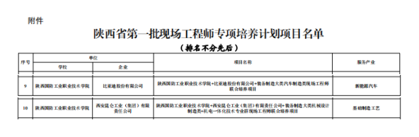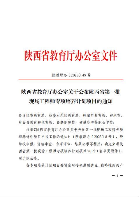 根据《陕西省教育厅办公室关于公布陕西省第一批现场工程师专项培养计划项目的通知》(陕教职办〔2023〕49 号),我校装备制造大类汽车制造类现场工程师联合培养项目、装备制造大类机械设计制造类机电一体化技术专业群现场工程师联合培养项目,获批陕西省第一批现场工程师专项培养计划项目。