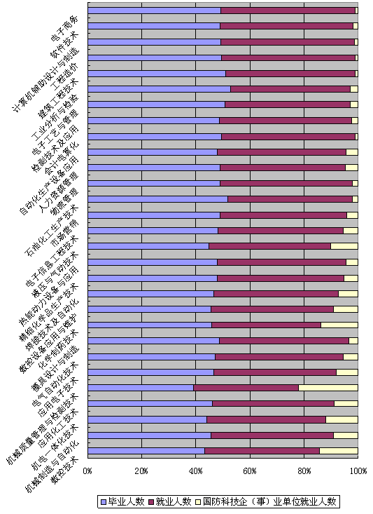 (1)学院共开设43个专业,涵盖了生化与药品、材料与能源、土建、制造、电子信息、公共事业及财经七个大类(占《普通高等学校高职高专教育指导性专业目录(试行)》大类中的36.84%),涉及到制药技术、化工技术、能源、土建施工、建筑设备、工程管理、机械设计制造、自动化、汽车、机电设备、计算机、电子信息、财务会计、市场营销、工商管理、能源、电力技术及公共管理等19小类(占《普通高等学校高职高专教育指导性专业目录(试行)》小类中的24.36%),基本形成了以制造类、生化与药品类和电子信息类为主,制造类、生化与药品类、电子信息类、土建类、材料与能源类、公共管理类和财经类相互支撑、协调发展的专业大类。专业设置与结构见表2。