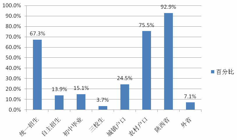 2012年招生总数4290名,高中起点招生3484名,其中统招生2887名、自主招生597名。陕西省招生3986名,占招生总数的92.9%,农村户口3238名,占75.5%。学院生源特点:农村生源和本省生源占绝大多数。生源结构见图3所示。
