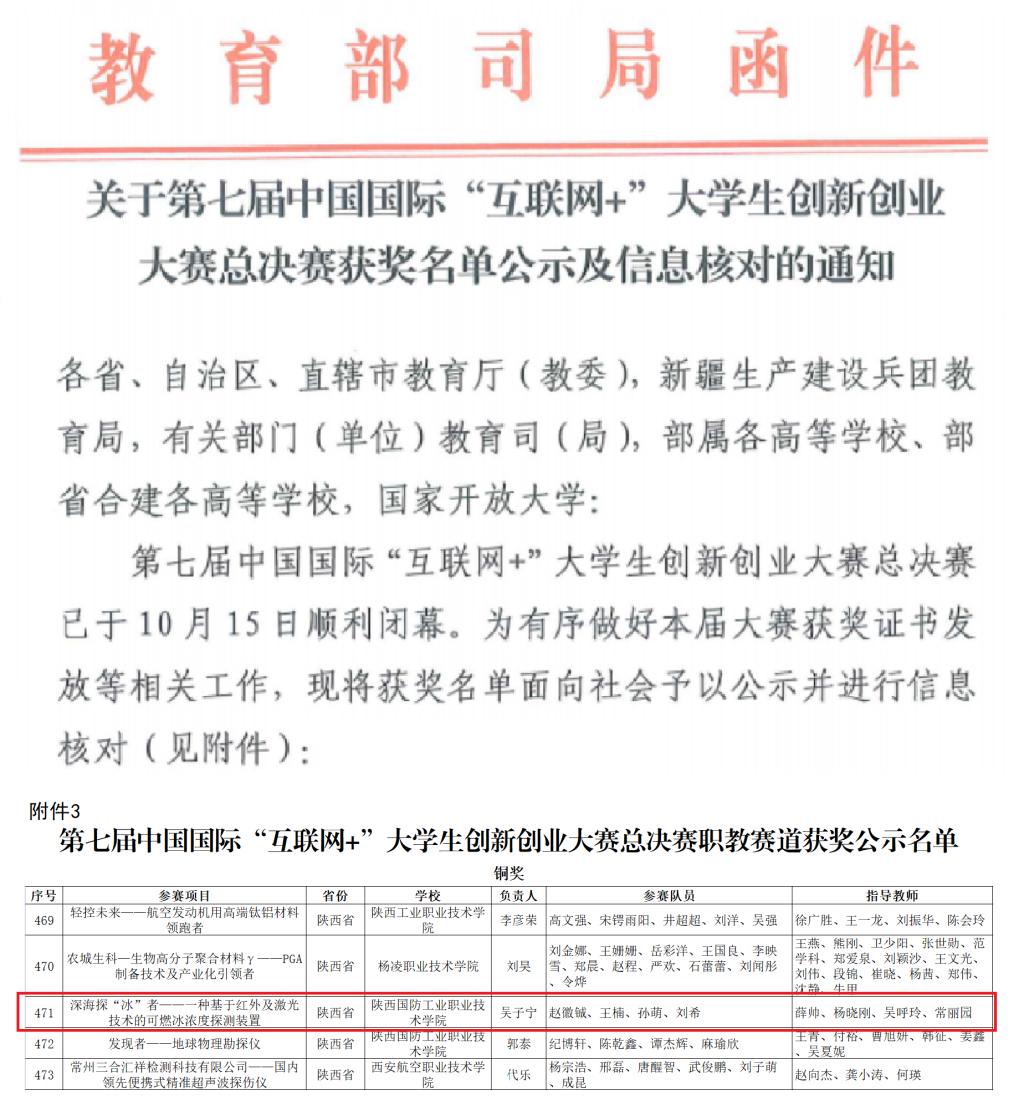 近日,教育部公示了第七届中国国际“互联网+”大学生创新创业大赛总决赛获奖名单。我校智能制造学院机械制造及自动化专业319级学生吴子宁、赵徽诚、王楠、孙萌、刘希(经管)申报的《深海探“冰”者——一种基于红外及激光技术的可燃冰浓度探测装置》项目荣获全国总决赛职教赛道铜奖。