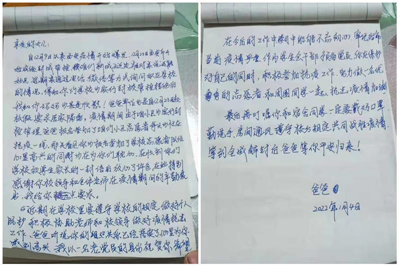 还有一位陕西的家长在家书中不仅鼓励她安心学习,遵守学校规定。同时还说道:爸爸也加入了小区抗疫志愿队,作为老党员希望刚入党的女儿能够尽自己所能走在防疫的第一线,为学校疫情防控做出自己力所能及的贡献。