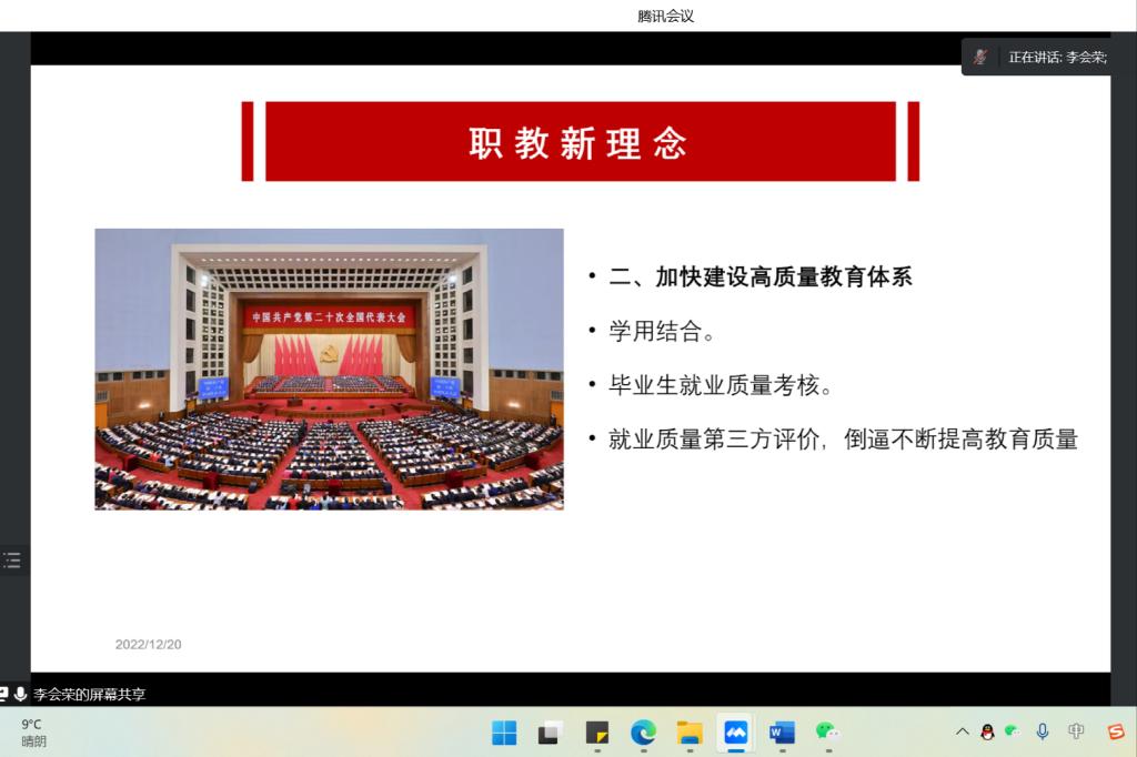 为深入学习宣传贯彻党的二十大精神,12月20日下午,机制教师党支部书记李会荣线上为支部党员讲授《二十大职教新理念》的“云”党课。